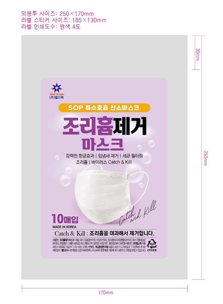 조리흄제거마스크는 우주선, 잠수함 등에 적용되는 호흡장치 SOP산소필터 여과로 유독성 성분을 흡수 제거하여 제습과 이산화탄소 제거와 산소발생의 탄소동화작용 등 조리흄, 유해가스를 89.5% 제거하는 개인호흡보호구마스크라고 강조혰다.