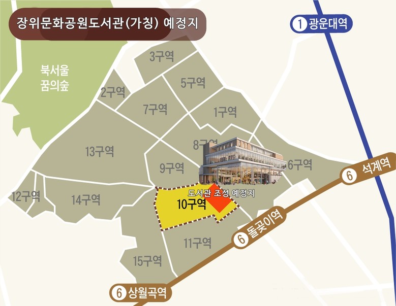 서울 성북구(구청장 이승로)는 이달 5일 장위10구역 내 공공기여 형태로 조성할 문화공원에 공공도서관 ‘장위문화공원도서관(가칭)’의 건축 허가를 마쳤다고 밝혔다. 구는 이 도서관을 올해 안에 착공할 계획이다.