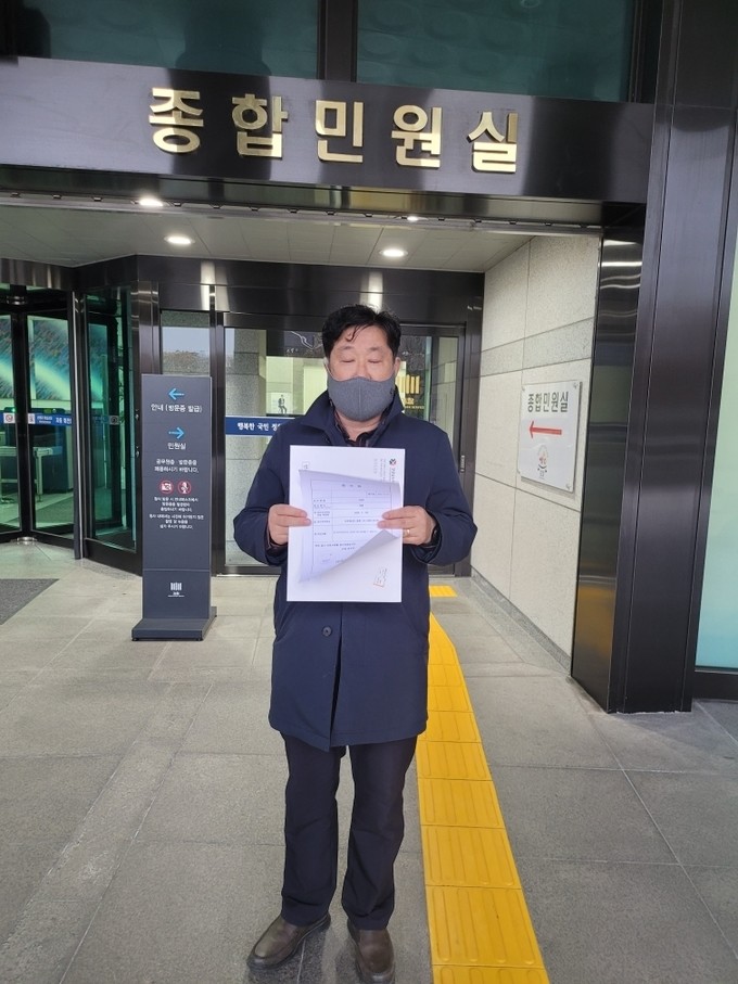 허홍 밀양시의원이 11월 29일 서울 서초동 대검찰청 민원실에 박일호 밀양시장을 '뇌물수수 혐의'로 고발장을 접수하기 전 고발장을 들어보이고 있다.(사진=허웅 의원 제공)
