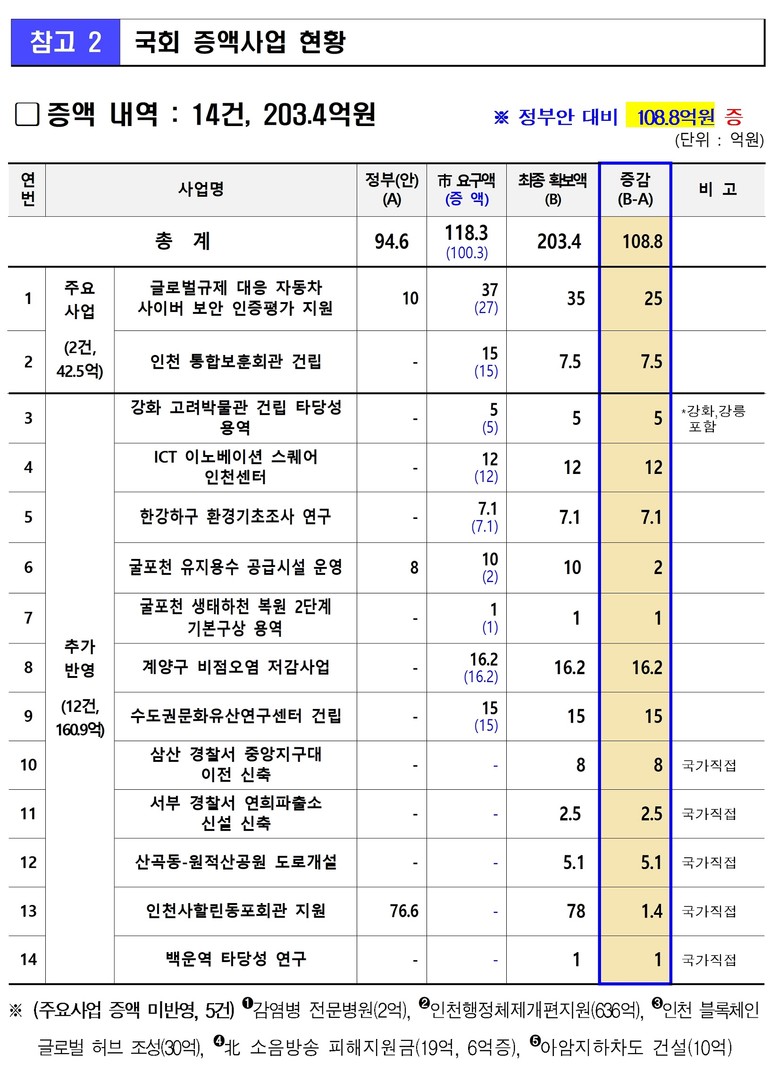 그 결과 국회 예산 심사 과정에서 ▲글로벌규제 대응 자동차 사이버보안 인증평가 지원(10억 → 35억, 25억 증), ▲인천 통합보훈회관 건립(7.5억, 순증), ▲강화 고려박물관 건립 타당성 용역(5억, 순증), ▲계양구 비점오염 저감시설 설치(16.2억, 순증) 등 정부안 대비 총 108억 원이 추가 반영되는 성과를 거두었다.