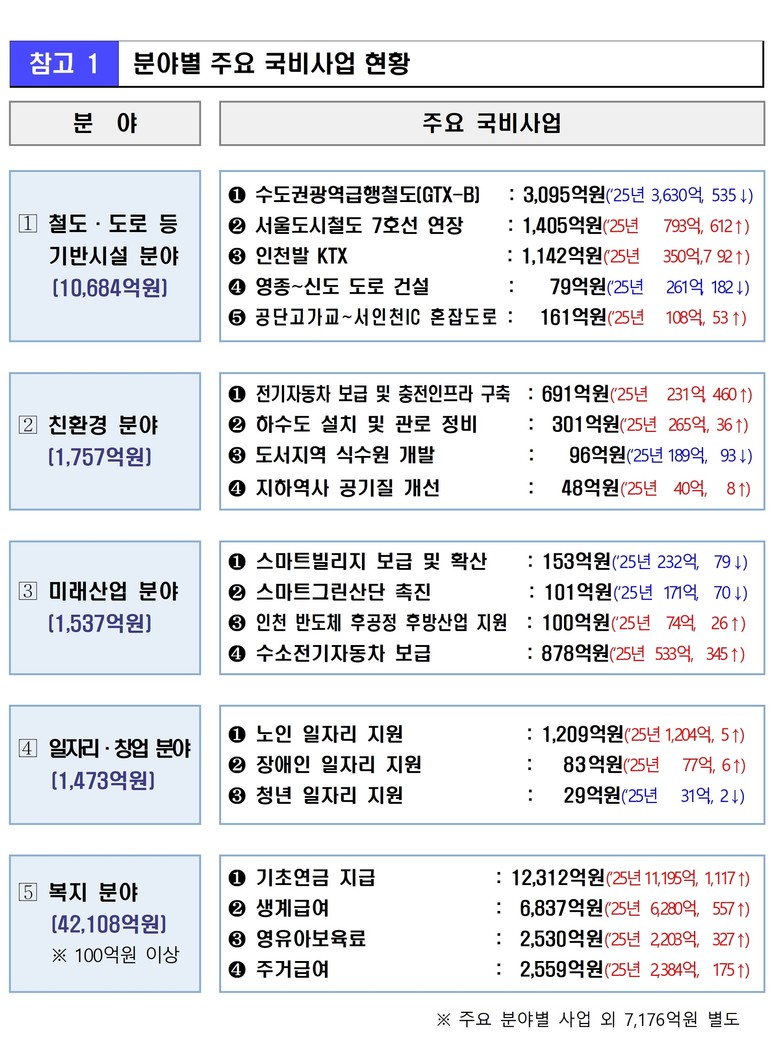 이번에 확보한 주요 국비 사업 인천의 미래 성장 기반을 다지고 시민의 삶의 질을 한층 더 높이는 데 기여할 것으로 기대된다. 주요 사업으로는 ▲수도권광역급행철도(GTX-B) 3,095억 원, ▲서울도시철도7호선 청라연장 1,405억 원, ▲인천발 KTX 1,142억 원, ▲서해5도 종합발전 지원 107억 원, ▲공단고가교-서인천IC 혼잡도로 개선 161억 원, ▲전기자동차 보급 및 충전 인프라 구축 691억 원, ▲수소자동차 보급 878억 원, ▲노인 일자리 지원 1,209억 원 등이다.