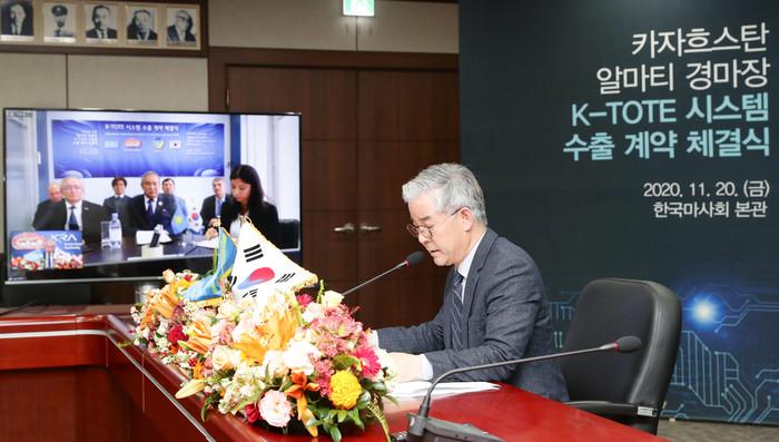 [세계타임즈 심귀영 기자]한국마사회와 카자흐스탄 알마티 경마장의 소유자인 텐그리인베스트먼트는 지난 20일 ‘카자흐스탄 알마티 경마장 발매시스템 공급 계약’을 온라인으로 체결했다. 김낙순 한국마사회장은 마사회 본관 대회의실에서, 사르센바예프 세리크 대표는 카자흐스탄 알마티 현지에서 온라인 시스템에 실시간 접속 후 계약서에 서명했다. 이번 계약은 한국어-러시아어 동시통역 방식으로 진행됐다. 이번 계약은 2백만불 규모의 경마 발매시스템 공급 계약으로, 마사회가 올해 5월부터 알마티 경마장 디지털화 사업 자문의 결실이다.