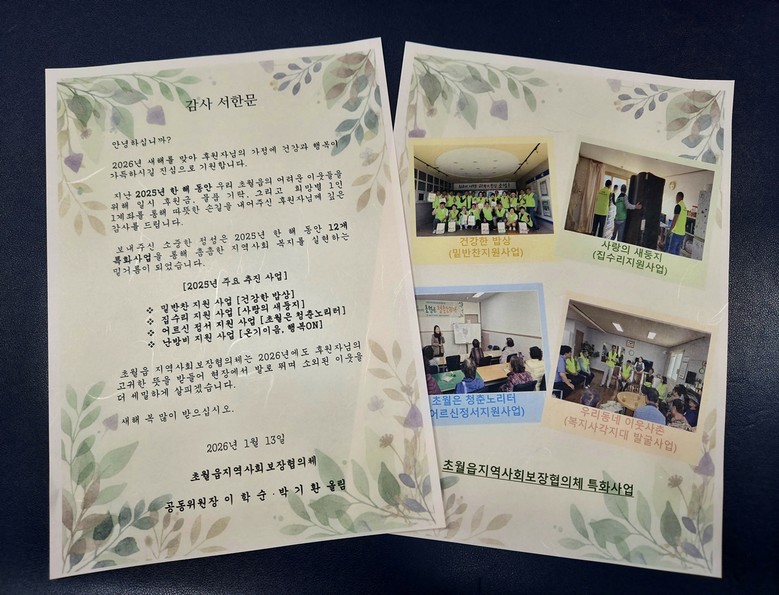 [광주시 세계타임즈=송민수 기자] 광주시 초월읍 지역사회보장협의체는 2025년 한 해 동안 지역 내 어려운 이웃을 위해 나눔을 실천한 후원자 145명에게 감사의 마음을 담은 서한문을 발송했다고 19일 밝혔다.