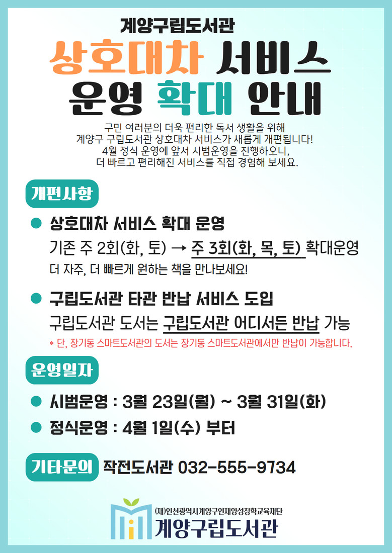 - 올해 타관 반납 서비스도 도입해 접근성 강화 - [계양구 세계타임즈=심하린 기자] (재)인천광역시계양구인재양성장학교육재단 계양구립도서관은 오는 4월 1일부터 상호대차 서비스 운영을 확대하고, 타관 반납 서비스를 새롭게 도입한다.