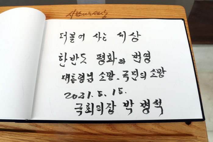 [세계타임즈 이영진 기자]박병석 국회의장이 15일 오전 경남 김해 봉하마을에서 故 노무현 전 대통령 묘역을 참배했다. 박 의장은 방명록에 “더불어 사는 세상. 한반도 평화와 번영. 대통령님 소망, 국민의 소망. 2021. 5. 15. 국회의장 박병석”이라고 썼다.