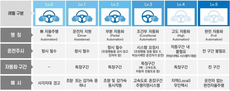 | ▲ 자율주행 기술단계(레벨3부터 자율주행차로 분류) * 美자동차공학회(SAE)의 분류, 국제기준회의체(UN/ECE/WP.29)도 동 분류 준용 「자율차법」은 레벨3을 ‘부분 자율차’, 레벨4∼5를 ‘완전 자율차’로 구분 |