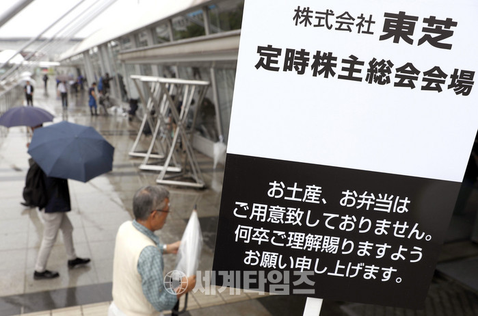 일본 도시바 주주들이 28일 정기주주총회에 참석하기 위해 도쿄 외곽 치바에 있는 회의장에 도착하고 있다. 2017.06.28
