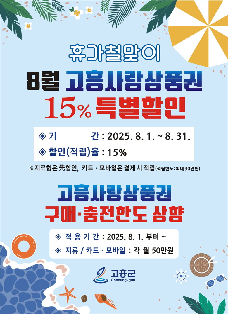공영민 군수는 “이번 특별할인이 휴가철 고흥을 방문하는 관광객과 군민들의 소비생활에 도움이 되길 바란다”며 “군민들이 체감하는 혜택을 한층 더 높여 지역경제에 선순환 효과로 나타나기를 기대한다”고 전했다.