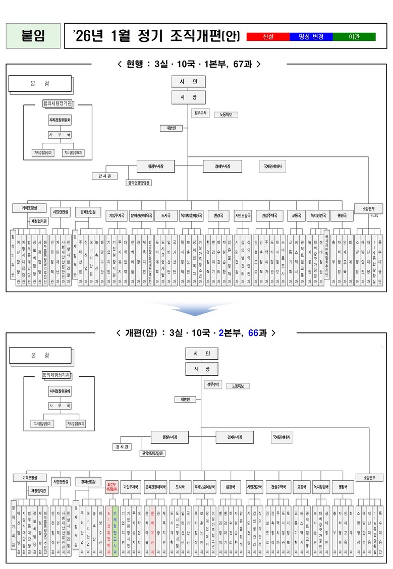 한편, 이번 조직개편(안)은 10월 2일부터 10월 13일까지 입법예고 후 시의회 심의·의결을 거쳐 내년 1월 1일에 시행될 예정이다.