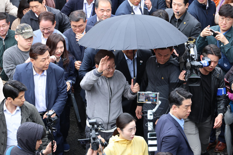 더불어민주당 이재명 대선 후보가 '골목골목 경청투어' 사흘째인 3일 '동해안벨트' 첫 방문지인 강원도 속초시 중앙재래시장에서 비가 그쳤음에도 우산을 쓴 채로 두터운 경호막에 둘러싸여 도민들을 향해 인사하고 있다. 2025.5.3