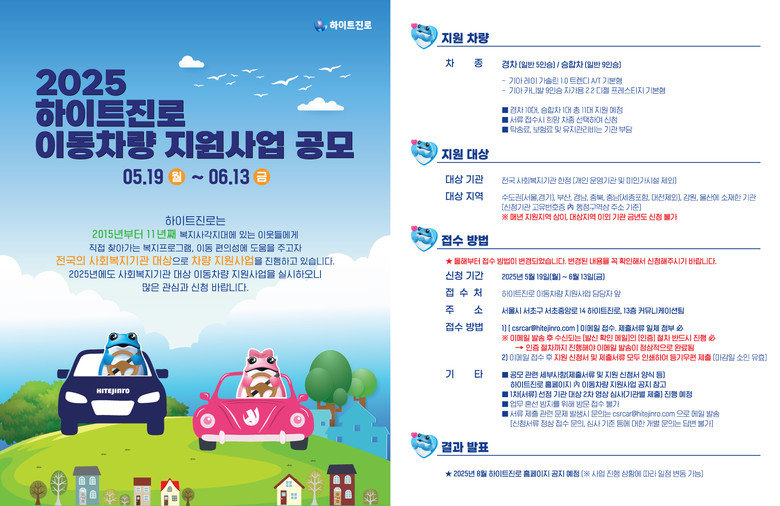 올해 지원 대상은 서울, 경기, 부산, 경남, 충북, 충남, 강원, 울산 지역내 사회복지기관으로, 지역내 사회복지기관 수와 상대적 후원 사각지역 등을 고려하여 지역을 선정했다. 지원 신청서와 제출 서류들은 이메일과 우편으로 접수하며 5월 19일부터 6월 13일까지 1차 서류 접수를 진행, 우편 서류 접수는 마감일 소인까지 유효하다. 이후 서류심사와 2차 영상심사를 거쳐 8월에 최종 선정 기관을 발표할 계획이다. 공모 관련 자세한 내용은 하이트진로 홈페이지의 이동차량 지원사업 공지를 통해 확인이 가능하다.