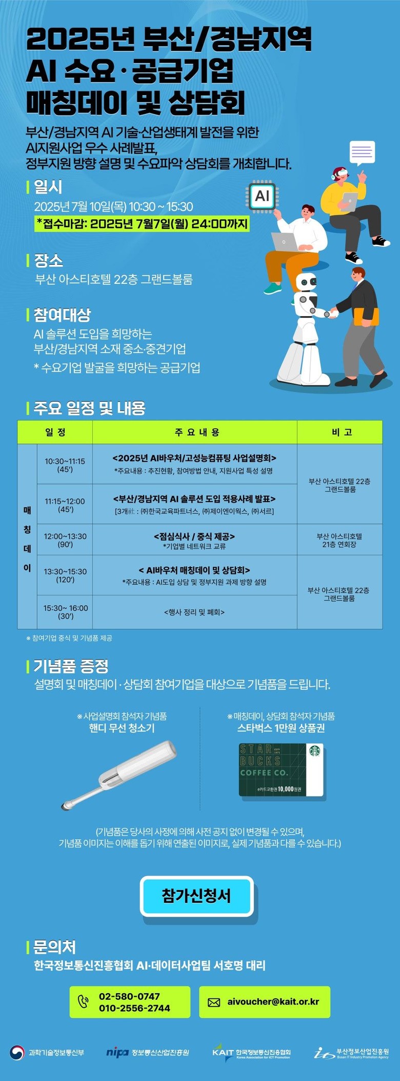 행사 참가 대상은 '인공지능(AI) 솔루션' 도입을 희망하는 부산·경남지역 소재 중소·중견기업으로, 오는 7월 7일까지 큐알(QR) 코드 또는 온라인 폼을 통해 참가 신청하면 된다.