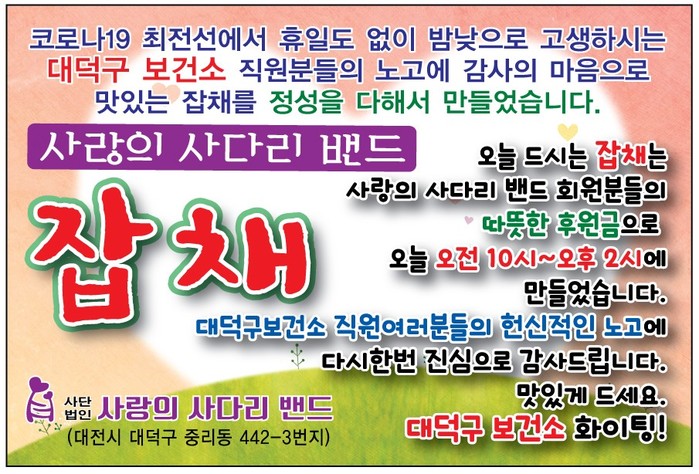 대덕구보건소 라미경 감염병관리팀장은 “오늘 사랑의 사다리 밴드 봉사단체에서 잡채를 간식으로 지원해 주어서 큰 힘과 위안이 된다.”면서 “대덕구보건소는 코로나 19가 하루속히 종식될 수 있도록 최선의 노력을 다하겠다.‘면서 감사함을 전했다.