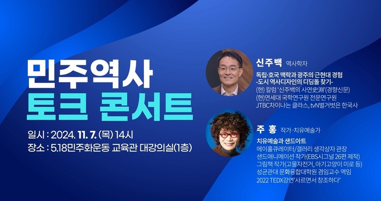 이날 강연에서는 역사학자인 신주백 성공회대학교 교수와 치유예술가 주홍 작가가 ‘광주의 민주역사’를 조명한다.