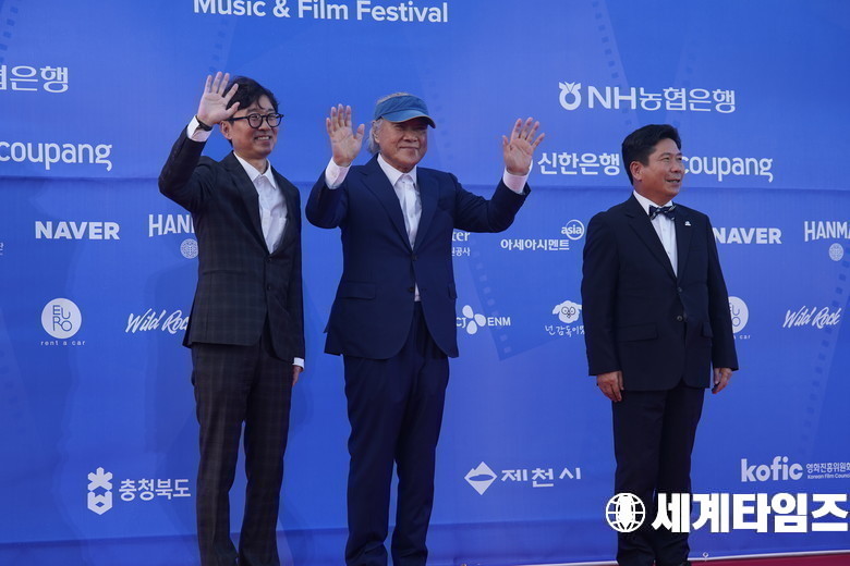 제천시장 '김창규'가 4일 충북제천 제천비행장에서 열린 ‘제21회 제천국제음악영화제(JIMFF)’에 참석해 레드카펫에 참석해 포즈를 취하고있다.