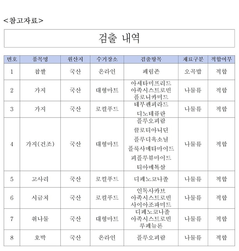 475종의 농약 성분을 분석한 결과, 전 항목이 기준치 이내로 나타났다. 일부 품목에서 아세타미프리드, 아족시스트로빈, 디페노코나졸 등 농약 성분이 검출됐으나 모두 잔류허용기준 이내로 확인됐다.