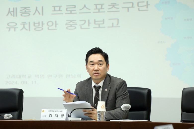 이날 간담회에는 김재형 대표의원을 비롯한 연구모임 회원과 연구용역수행업체 등 10여 명이 참석했다. 참석자들은 스포츠산업 활성화를 위한 세종시 프로스포츠 구단 유치방안 검토를 위해 지난 5월 말부터 연구용역을 진행한 에스시아이의 보고를 청취했다.