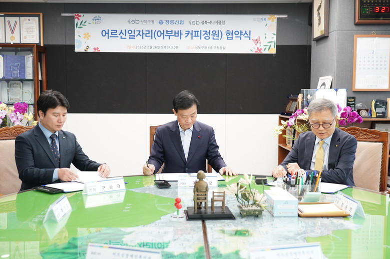 [성북구 세계타임즈=이장성 기자] 성북구(구청장 이승로)와 정릉신협, 성북시니어클럽이 지난 26일 어르신 일자리 창출을 위한 ‘어부바 커피정원’ 운영 협약식을 개최했다.