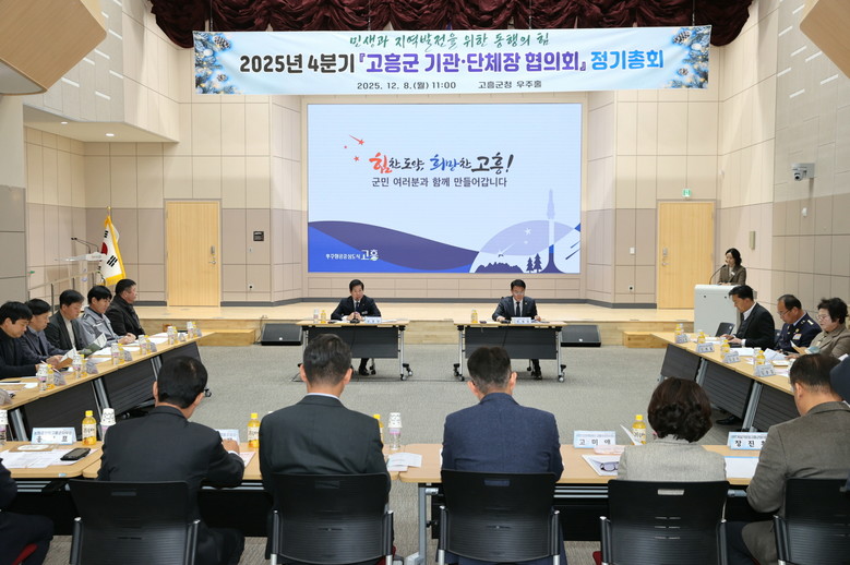 [고흥군 세계타임즈=우덕현 기자] 고흥군(군수 공영민)은 지난 8일 군청 우주홀에서 관내 기관·단체장 34명이 참석한 가운데 ‘2025년 4분기 고흥군 기관·단체장 협의회’를 개최했다고 밝혔다.