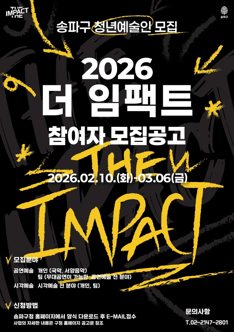 4년째 이어온 청년예술인 발굴·지원 사업… 활동 무대와 지원금 제공 [송파구 세계타임즈=이장성 기자] 서울 송파구는 재능 있는 청년예술인을 발굴·지원하는 ‘2026 더 임팩트’ 참가자를 오는 3월 6일 오후 5시까지 모집 중이라고 23일 밝혔다. 이번 공모는 지난 2월 10일부터 접수가 진행되고 있다.