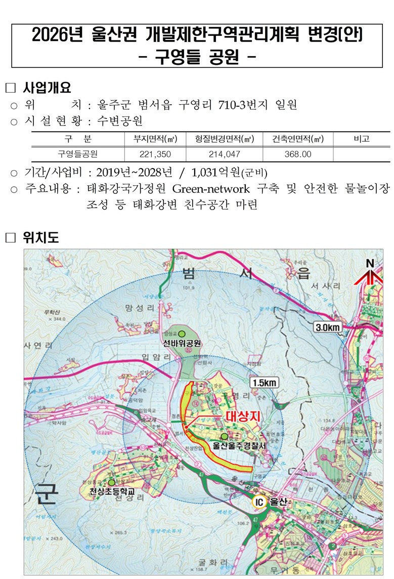 이에 따라, 울산시는 지난 2023년부터 안전한 물놀이장 설치 필요와 녹지 확보 등 입지 불가피성 및 공원 조성의 최적지라는 설득 논리를 개발해 국토교통부 사전심사를 거쳐 최종 승인 단계인 중앙도시계획위원회 심의를 통과하게 됨에 따라 조속한 사업 추진이 가능해졌다.
