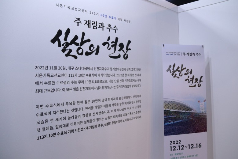 사진전은 지난달 20일 대구스타디움에서 열린 시온기독교선교센터 113기 10만 수료식을 홍보하기 위해 열린 것으로 당시 수료식 현장의 생생함을 사진과 영상을 통해 느낄 수 있게 기획되었다.