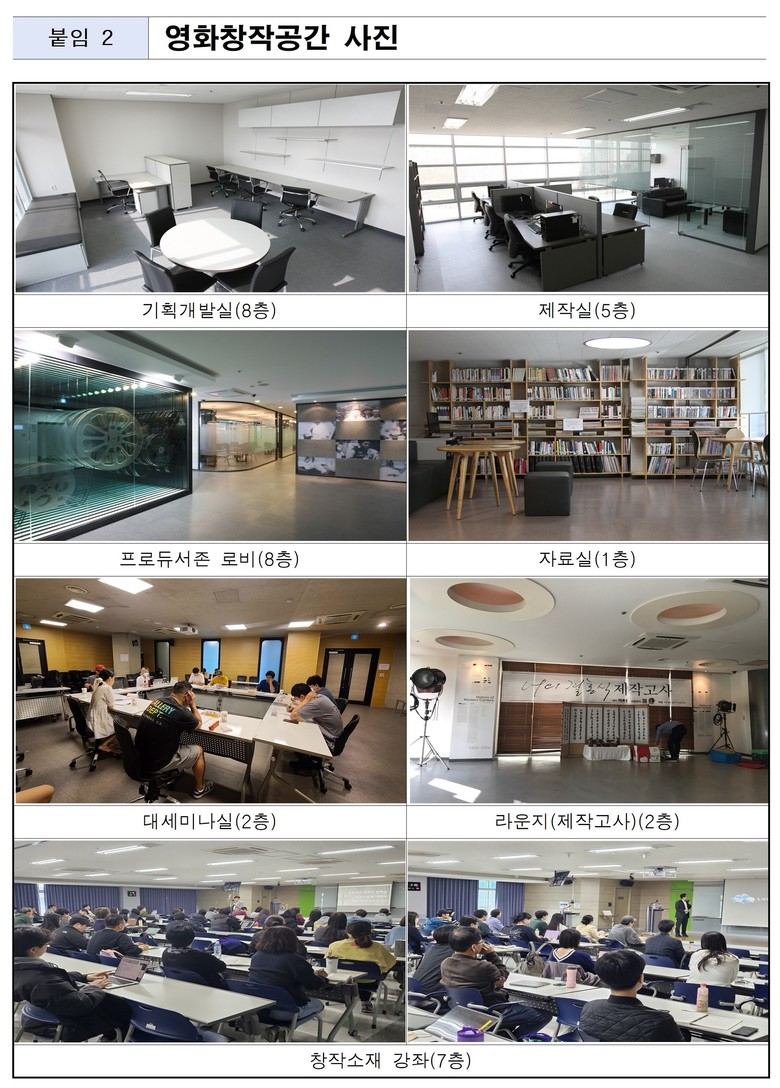 영화창작공간은 약 2,400평(7,898㎡) 규모의 대규모 영화・영상 콘텐츠 개발 공간으로 ▴감독존 18실 ▴프로듀서존 40실 ▴작가존 42실(개인실 20실, 오픈실 12실, 개별실 10실) ▴오피스존 5실 ▴프로덕션존 12실 등 총 117실로 구성돼 있다. 입주자는 개인 작업실 외에도 세미나실, 회의실, 자료실 등 다양한 공용공간을 자유롭게 이용할 수 있다.