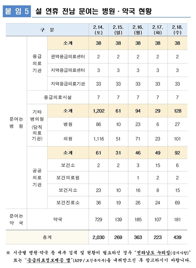 연휴 기간 이용가능한 병원과 약국 정보는 전남도청 누리집 공지사항과 응급의료포털(또는 응급의료정보제공 앱)에서 확인할 수 있다.