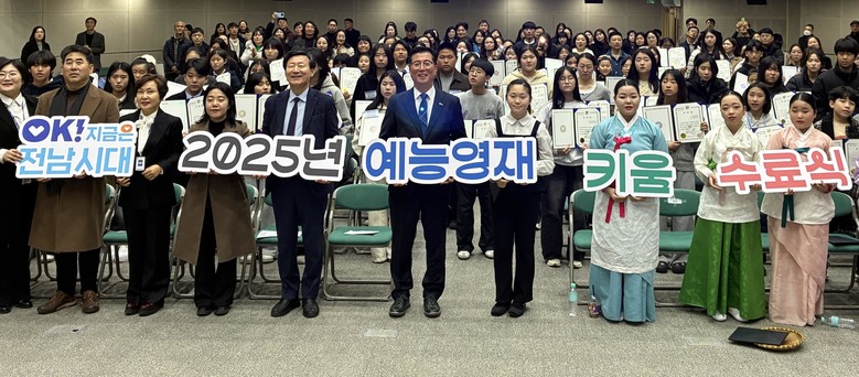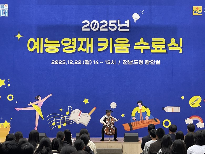 [전남 세계타임즈=우덕현 기자] 전라남도는 도청 왕인실에서 2025년 예능영재 키움 수료식을 지난 22일 열어 1년간의 교육과정을 성실히 이수한 예능영재 학생들을 격려했다.
