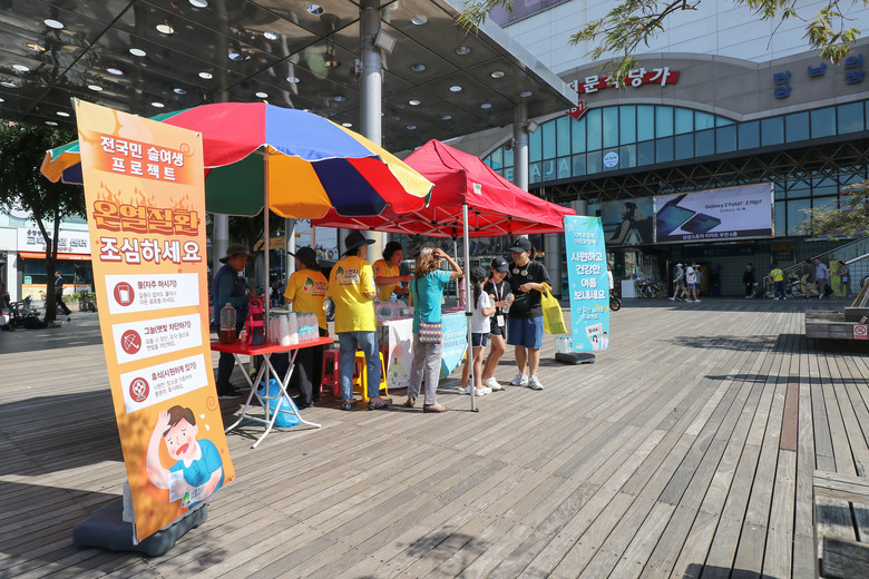 지난 8월 2일에 이어 16일 부천지부 봉사자 10명이 부천역 광장에서 건강한 여름나기를 기원하는 인사말을 건네며 오후 3시부터 약 2시간 동안 생수 나눔 봉사를 진행했다. 이틀간 지나가는 시민들에게 생수 500개와 결명자차 300잔을 나누며 온열질환 예방을 위한 건강 수칙을 안내했다.