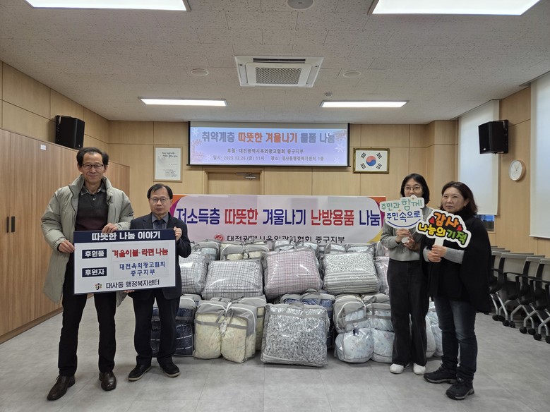 유재경 동장은 “어려운 이웃을 위해 이불과 라면을 지원해주신 대전옥외광고협회 중부지부 회원분들의 정성에 감사드리며, 기탁해주신 물품은 필요한 분들에게 잘 전달하겠다”라고 답했다.