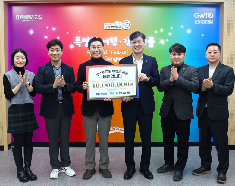 재단은 지난 1월 29일(목) 강원관광재단 대회의실에서 최성현 대표이사와 신한은행 강원영서본부 박재환 본부장이 참석한 가운데‘2025-2026 강원 방문의 해’ 성공 추진을 위한 기부금 전달식을 가졌다고 밝혔다.