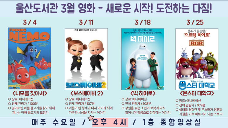매주 수요일 오후 4시 도서관 1층 종합영상실 [울산 세계타임즈=이호근 기자] 울산도서관은 다가오는 3월에 ‘새로운 시작! 도전하는 다짐’이라는 주제로 4편의 만화영화(애니메이션)를 상영한다.