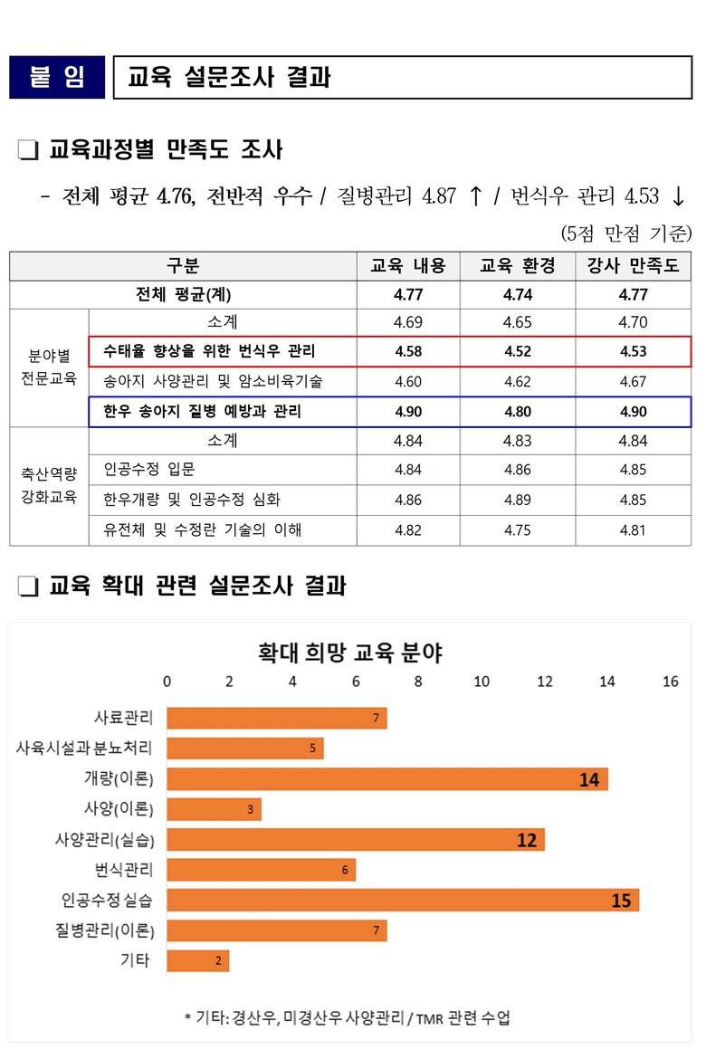 특히 만족도가 높았던 ‘한우 개량 및 인공수정 심화 과정’은 교육 횟수를 확대하고, 암소 모형 교보재를 활용한 실습을 강화해 교육의 실효성을 높일 계획이다.