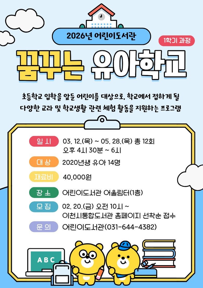 이번 모집은 2026년 1학기 과정으로, 3월 12일(목)부터 5월 28일(목)까지 매주 목요일 오후 4시 30분부터 6시까지 총 12회차로 운영된다. 참여자 모집은 2월 20일(금) 오전 10시부터 이천시통합도서관 누리집(https://www.icheonlib.go.kr)을 통해 선착순으로 진행된다.