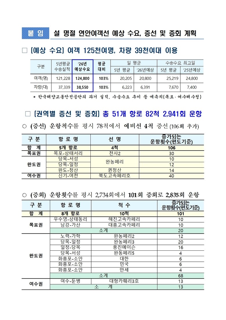 박근식 전남도 해운항만과장은 “설을 맞아 고향을 찾는 귀성객과 섬 주민이 보다 안전하고 편안하게 여객선을 이용하도록 유관기관과 긴밀히 협력해 안전관리와 수송 대응에 최선을 다하겠다”고 말했다.
