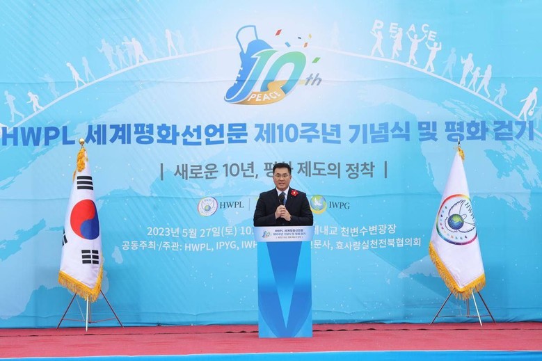[세계타임즈 = 최준필 기자] (사)하늘문화세계평화광복(HWPL, 대표 이만희)글로벌12지부가 지난 5월 27일 오전 10시 전주시 삼천천 기접놀이전수관 앞 하천변에서 ‘HWPL 세계평화선언문 제10주년 기념식 및 평화 걷기’ 행사를 개최했다.