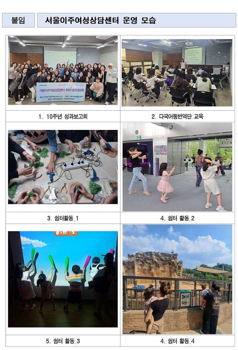 ○ (맞춤형 행정서비스 제공) 이주여성의 경우 언어장벽 외 다양한 문제로 인해 국내의 무료법률 지원 서비스를 제대로 이용하지 못하고 있어, 이를 위한 전문상담원을 배치해 ▴상담 통역 ▴소송서류 번역지원 ▴법원 동행 등 실질적인 맞춤형 도움을 제공하고 있다. 모든 센터 관련 서비스는 대표 번호(☏02-733-0120)로 문의 가능하다.
