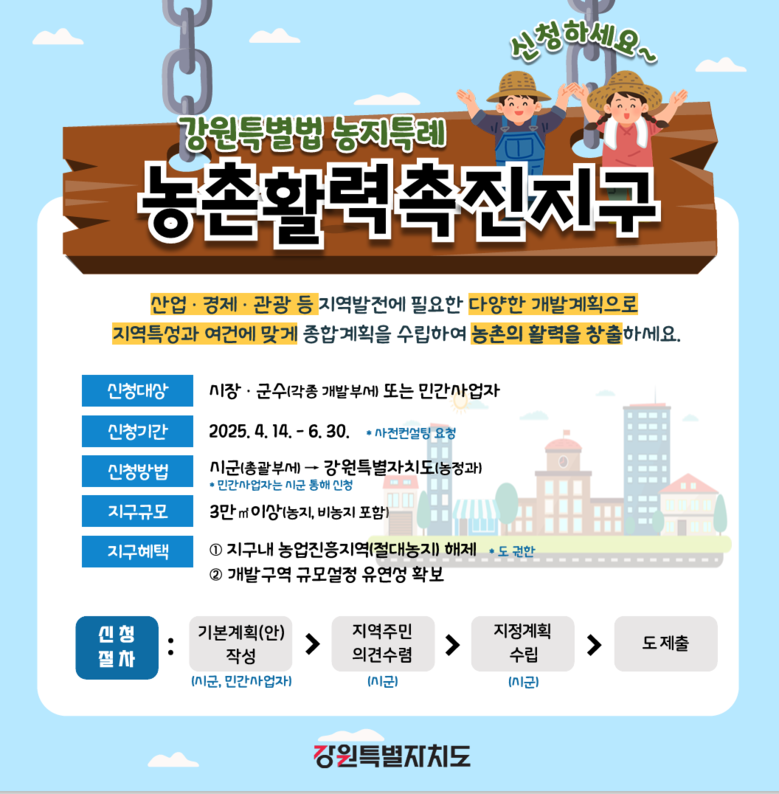 - 4월 14일부터 6월 30일까지 3차 농촌활력촉진지구 접수 시작 [강원도 세계타임즈=김민석 기자] 강원특별자치도(도지사 김진태)는 강원특별법 2차 개정을 통해 확보한 4대 규제 완화 성과 중 하나인 ‘농촌활력촉진지구 지정’의 실질적인 성과 창출을 위해 도내 시군을 대상으로 적극적인 참여 독려에 나섰다.