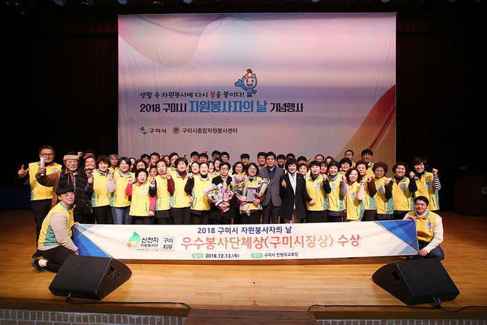 신천지 자원봉사단 구미지부(이하 구미 신자봉·지부장 우경언)은 지난 13일 2018년 구미시 자원봉사자의 날 기념행사에서 ‘우수 자원봉사 단체상 시장 상’을 수상하는 영예를 안았다.