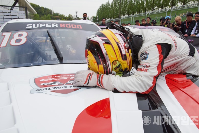 슈퍼레이스 슈퍼 6000 클래스 2라운드 우승자 이찬준이 경기 후 감격하고 있다
