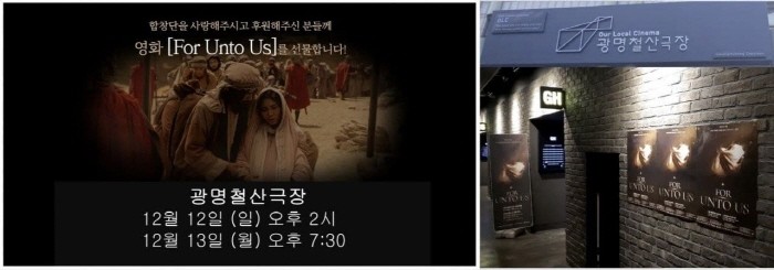 진정한 크리스마스의 의미를 전하며 진한 감동과 기쁨을 선사해준, “FOR UNTO US” 영화를 서울상영에 이어 곧이어 광명시민을 위한 영화 상영을 12일과 13일 두 차례, 광명시 철산극장에서 앵콜 상영을 했다.