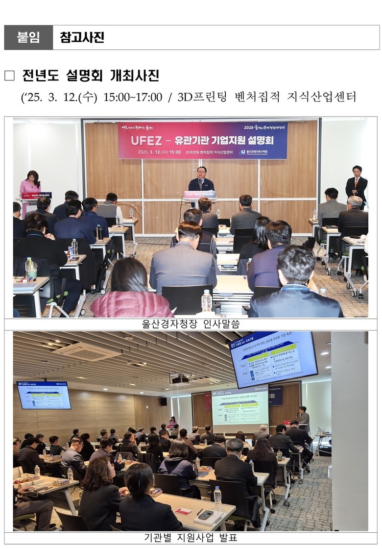 한편, 울산경제자유구역청은 지난 2024년 말 지역 혁신기관과 입주기업 지원을 위한 업무협약을 맺고, 기관 간 연계하여 입주기업에 지원사업을 안내하고자 2025년 3월 울산경제자유구역(UFEZ)-유관기관 기업지원 설명회를 개최한 바 있다.