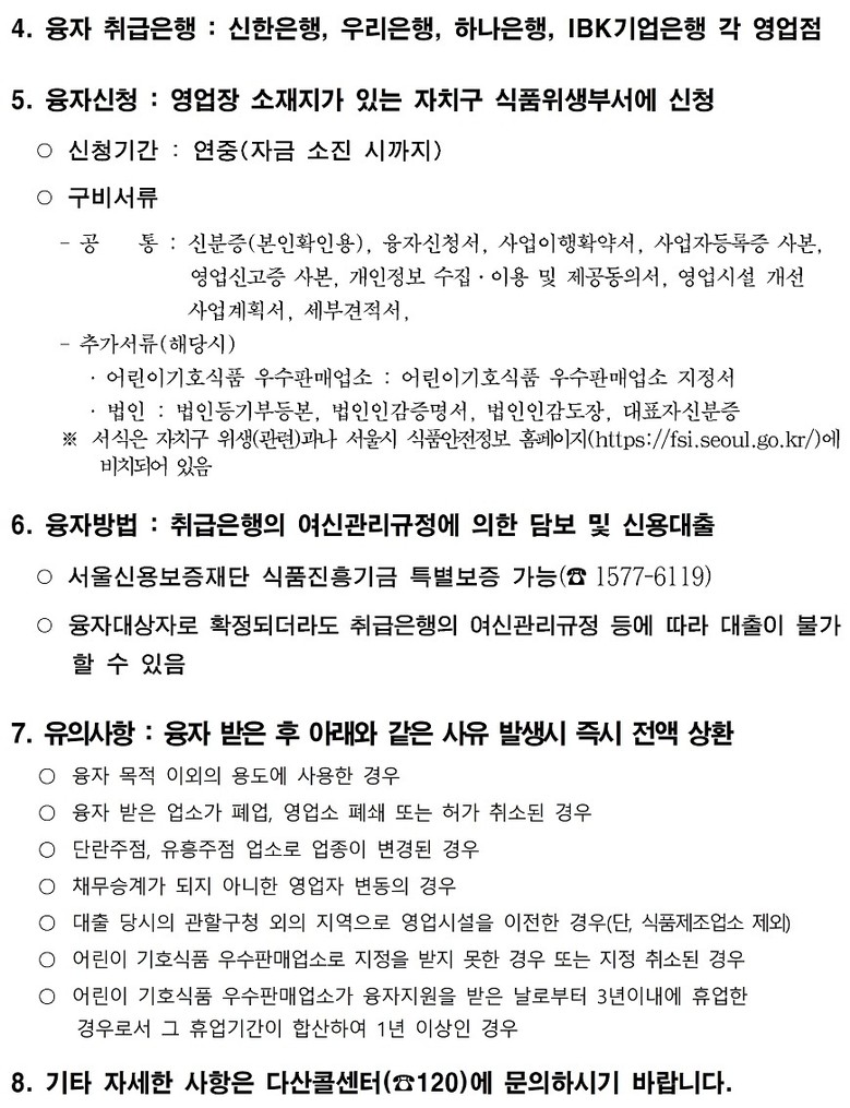 융자지원에 대한 상세한 정보는 전용 누리집(fsi.seoul.go.kr, 위생업소관리 → 식품 진흥기금 융자지원)에서 확인할 수 있다.