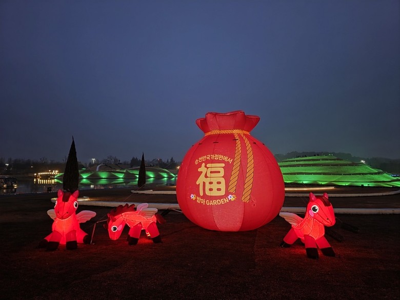 설 명절을 맞아 순천만국가정원에 들어서는 순간, 관람객은 가장 먼저 ‘복’(福)을 만난다. 적토마 포토존을 시작으로, 4m 높이에 달하는 대형 복 주머니, 새해를 상징하는 2026년 대형 토피어리, 캐릭터 포토존 루미뚱이까지 정원 곳곳이 사진 명소로 꾸며졌다. 정원 전체가 하나의 무대이자 배경이 되며, 관람객들은 자연스럽게 새해 소망을 담은 인증샷을 남길 수 있다.