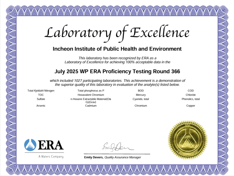 환경분야 국제숙련도 평가는 국제표준화기구(ISO/IEC 17043) 인증을 받은 미국환경자원협회(ERA)에서 진행하는 프로그램으로, 전 세계 80여 개국의 정부기관, 대학연구소, 민간분석기관이 참여해 분석능력을 검증받는 국제적 인지도와 공신력이 있는 평가다.