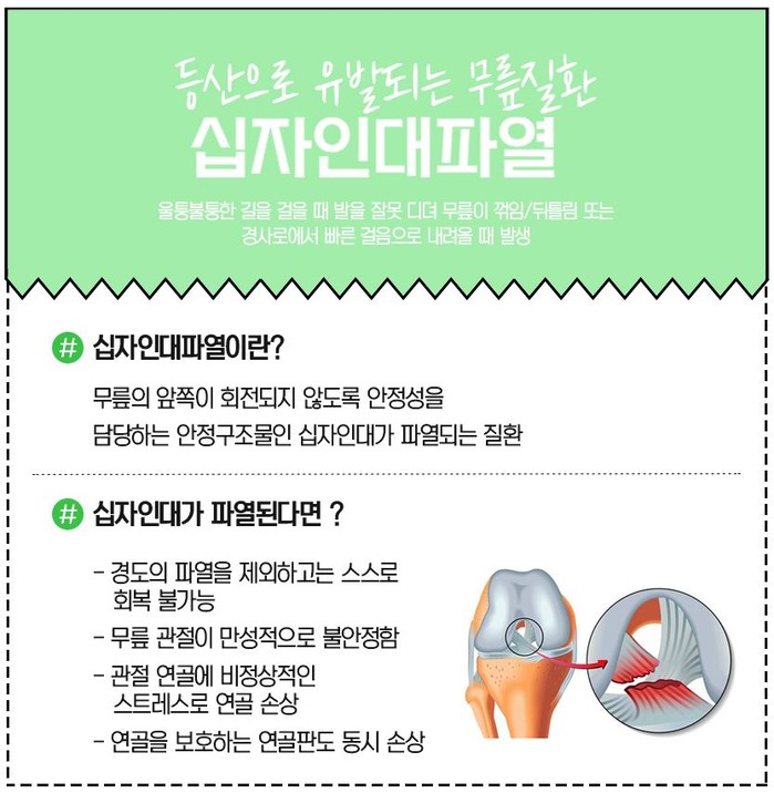 큰 부상이 생길 수도 있다. 바로 십자인대의 파열이다. 십자인대는 우리 무릎의 앞쪽이 쉽게 흔들리지 않도록 안정적으로 잡아주는 인대다. 등산을 하다가 발목을 잘못 디뎌 무릎이 꺾이게 되면 이 뚝 소리가 나면서 이 십자인대가 파열될 수 있다. 십자인대는 길게는 6개월까지 치료를 요하는 중부상이다. 또 방치하면 관절염 등으로 이어질 수 있기 때문에 빠른 치료를 해야 한다.
