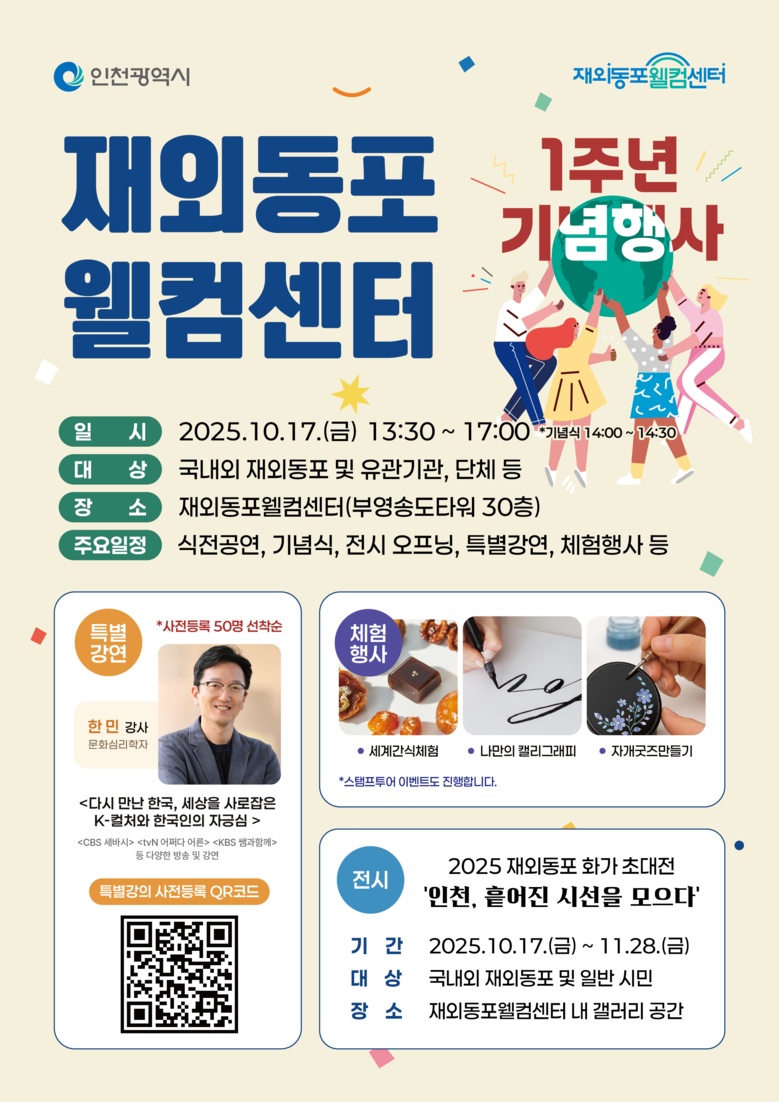 아울러 재외동포웰컴센터 내 갤러리에서는‘2025 재외동포 화가 초대전-인천, 흩어진 시선을 모으다’가 전시 오프닝을 시작으로 재외동포 작가 32명이 참여한 47점의 작품을 선보이며, 11월 28일까지 시민들에게 공개된다.
