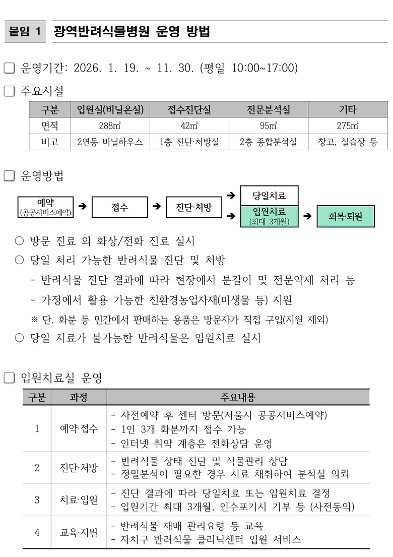 서울시는 이러한 운영 성과를 바탕으로, 올해 반려식물병원의 운영 방향을 기존 ‘방문 진료 중심’에서 ‘시민 상황 맞춤형 진료 체계’로 확대한다.
