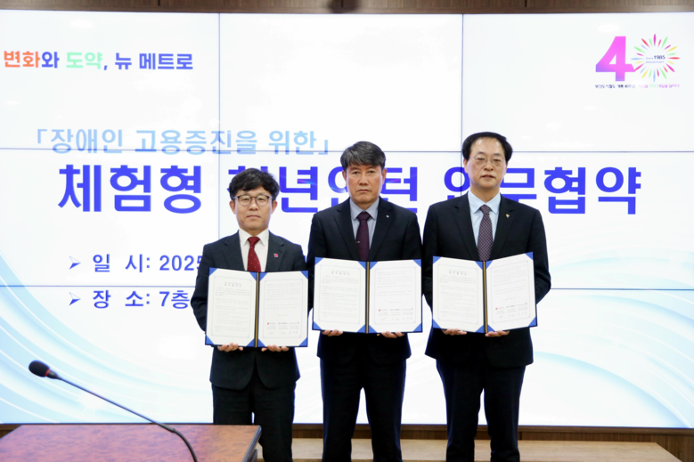 [부산 세계타임즈=이용우 기자] 부산시(시장 박형준)는 어제(10일) 부산교통공사, 한국장애인고용공단 부산지역본부와 '장애인 고용증진을 위한 체험형 청년인턴 업무협약'을 체결했다고 밝혔다.